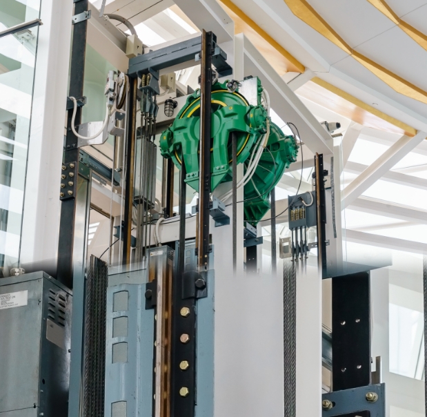 We also provide a highly reliable and efficient machine room elevator equipped with high braking torque and high insulation class of motor. With Hitachi’s highly systematic control system, a precise travelling speed curve and output according to the distance from the car location to the destination floor is calculated so that the travelling efficiency is improved.