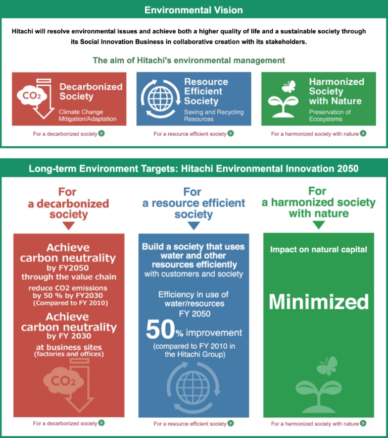 According to our Environmental Vision, Hitachi will resolve environmental issues and achieve both a higher quality of life and a sustainable society through its Social Innovation Business in collaboration with its stakeholders. As a global leader, we will aim to globally build a low-carbon, a resource-efficient, and a harmonized society with nature.